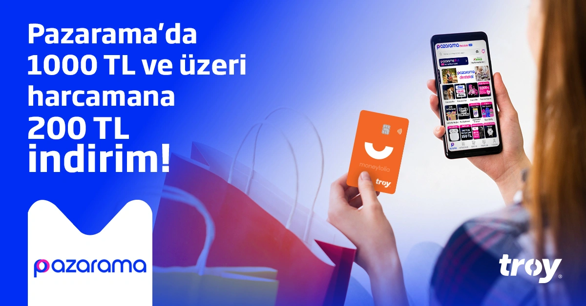 Moneytolia TROY Kart’la Pazarama’da tek seferlik 1.000 TL ve üzeri harcamana 200 TL indirim!